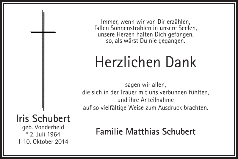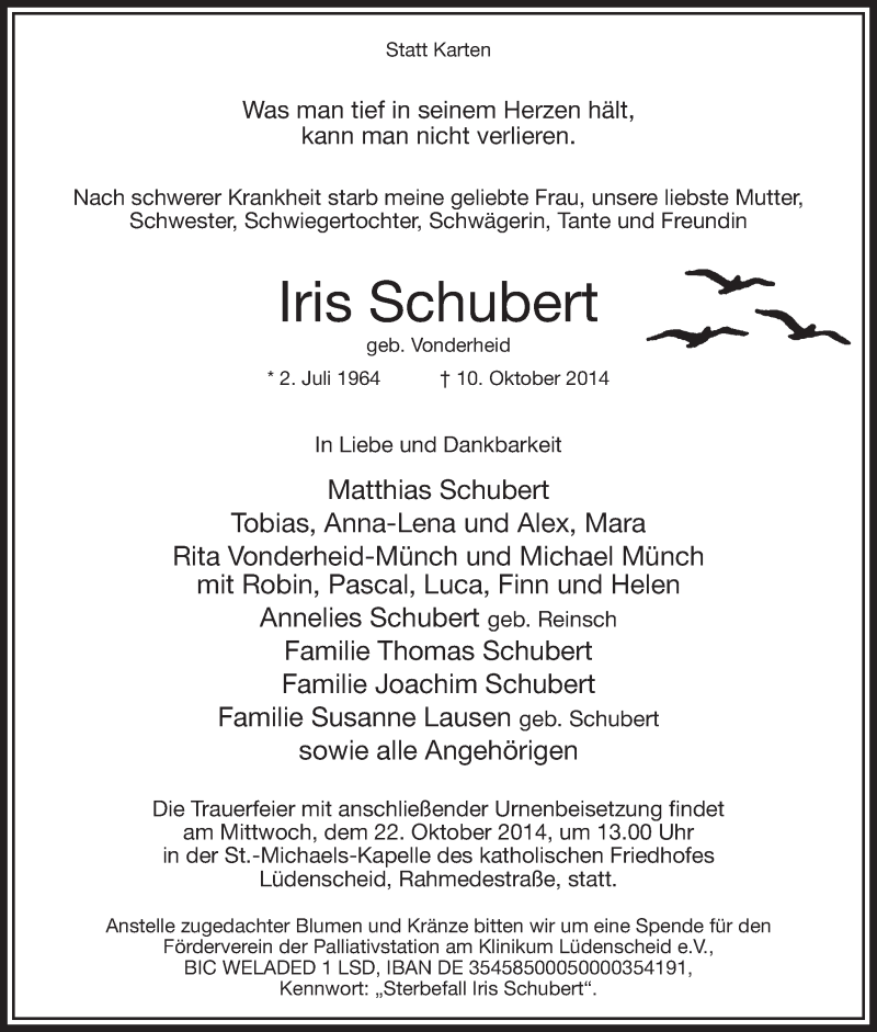 Hier finden Sie alle Traueranzeigen aus der Zeitung, die bisher für Iris Schubert erschienen sind. Weitere Traueranzeigen, die in der Zeitung erscheinen, werden hier ebenfalls aufgelistet