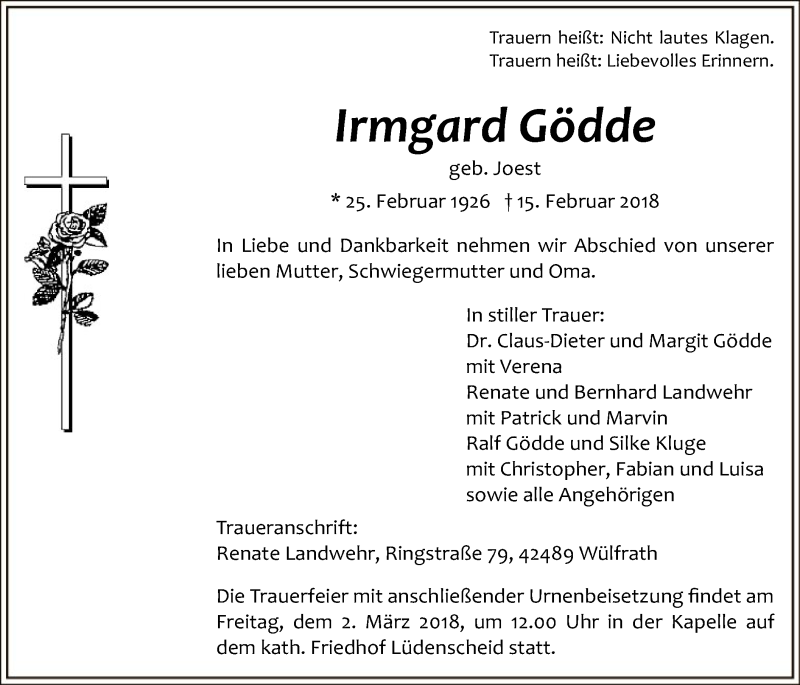 Hier finden Sie alle Traueranzeigen aus der Zeitung, die bisher für Irmgard Gödde erschienen sind. Weitere Traueranzeigen, die in der Zeitung erscheinen, werden hier ebenfalls aufgelistet
