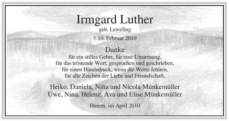 Hier finden Sie alle Traueranzeigen aus der Zeitung, die bisher für Irmgard Luther erschienen sind. Weitere Traueranzeigen, die in der Zeitung erscheinen, werden hier ebenfalls aufgelistet