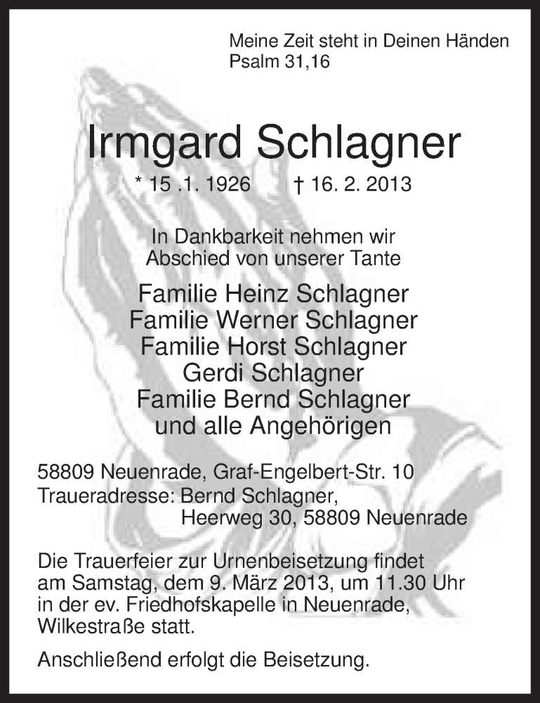 Hier finden Sie alle Traueranzeigen aus der Zeitung, die bisher für Irmgard Schlagner erschienen sind. Weitere Traueranzeigen, die in der Zeitung erscheinen, werden hier ebenfalls aufgelistet