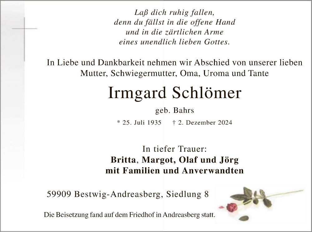 Hier finden Sie alle Traueranzeigen aus der Zeitung, die bisher für Irmgard Schlömer erschienen sind. Weitere Traueranzeigen, die in der Zeitung erscheinen, werden hier ebenfalls aufgelistet