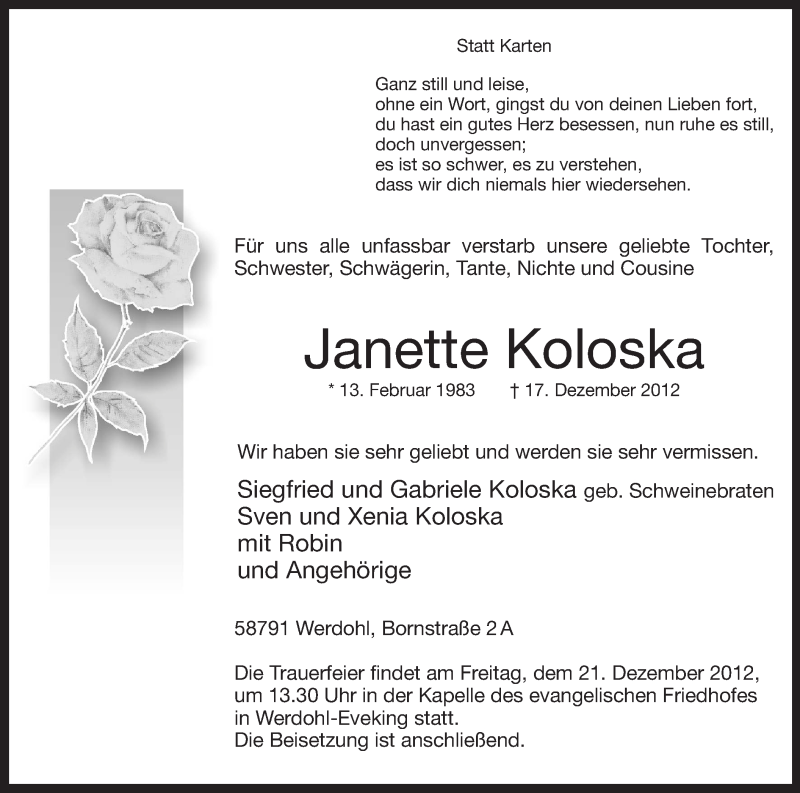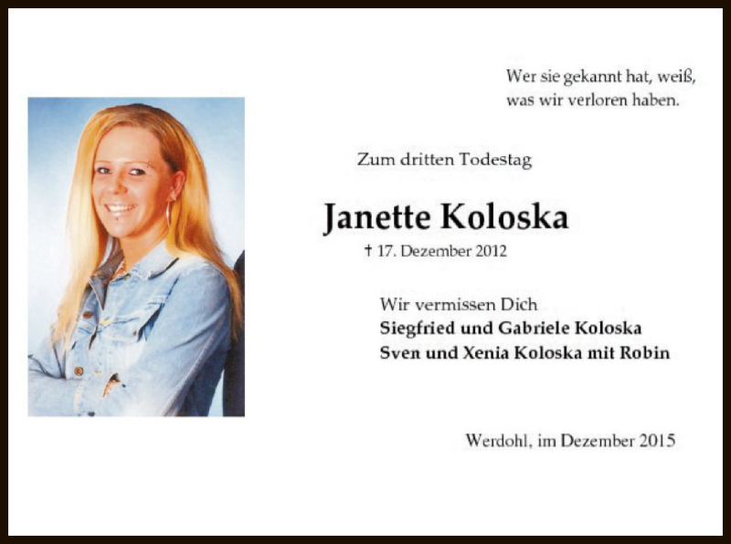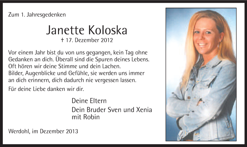 Hier finden Sie alle Traueranzeigen aus der Zeitung, die bisher für Janette Koloska erschienen sind. Weitere Traueranzeigen, die in der Zeitung erscheinen, werden hier ebenfalls aufgelistet