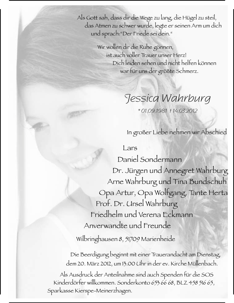 Hier finden Sie alle Traueranzeigen aus der Zeitung, die bisher für Jessica Wahrburg erschienen sind. Weitere Traueranzeigen, die in der Zeitung erscheinen, werden hier ebenfalls aufgelistet