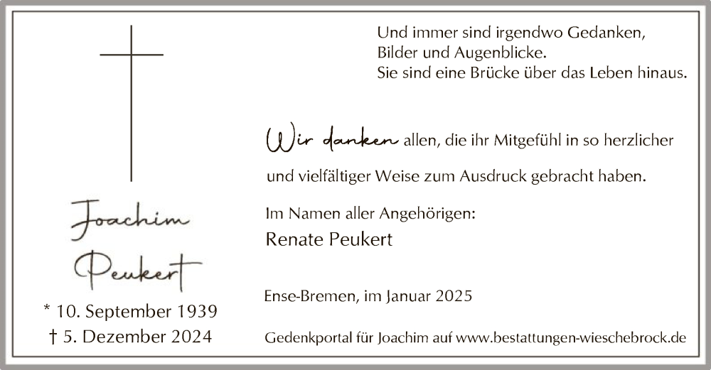 Hier finden Sie alle Traueranzeigen aus der Zeitung, die bisher für Joachim Peukert erschienen sind. Weitere Traueranzeigen, die in der Zeitung erscheinen, werden hier ebenfalls aufgelistet