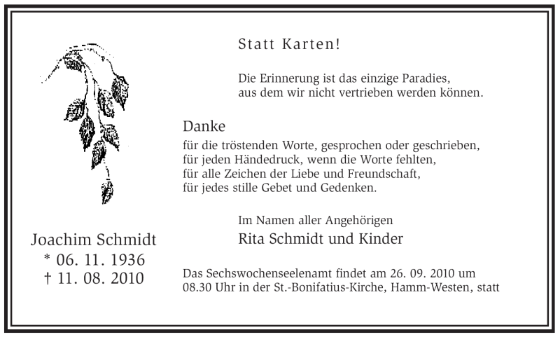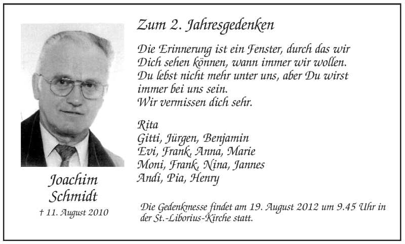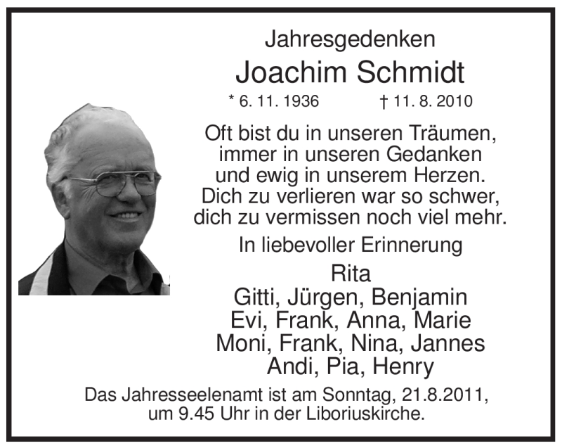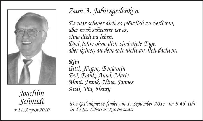 Hier finden Sie alle Traueranzeigen aus der Zeitung, die bisher für Joachim Schmidt erschienen sind. Weitere Traueranzeigen, die in der Zeitung erscheinen, werden hier ebenfalls aufgelistet