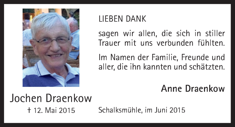 Hier finden Sie alle Traueranzeigen aus der Zeitung, die bisher für Jochen Draenkow erschienen sind. Weitere Traueranzeigen, die in der Zeitung erscheinen, werden hier ebenfalls aufgelistet