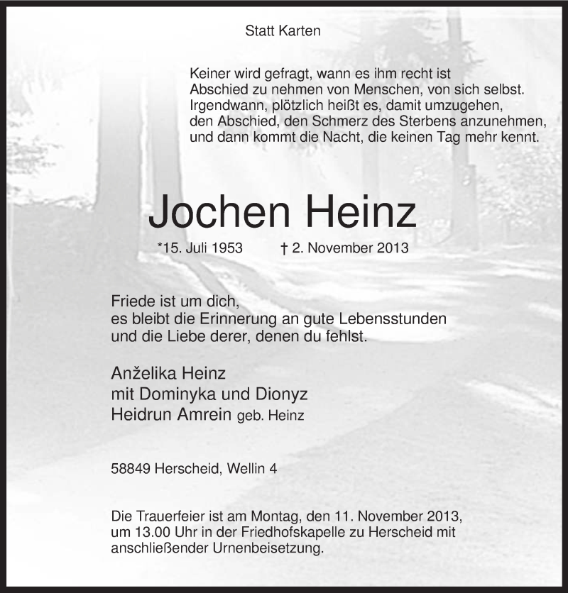 Hier finden Sie alle Traueranzeigen aus der Zeitung, die bisher für Jochen Heinz erschienen sind. Weitere Traueranzeigen, die in der Zeitung erscheinen, werden hier ebenfalls aufgelistet