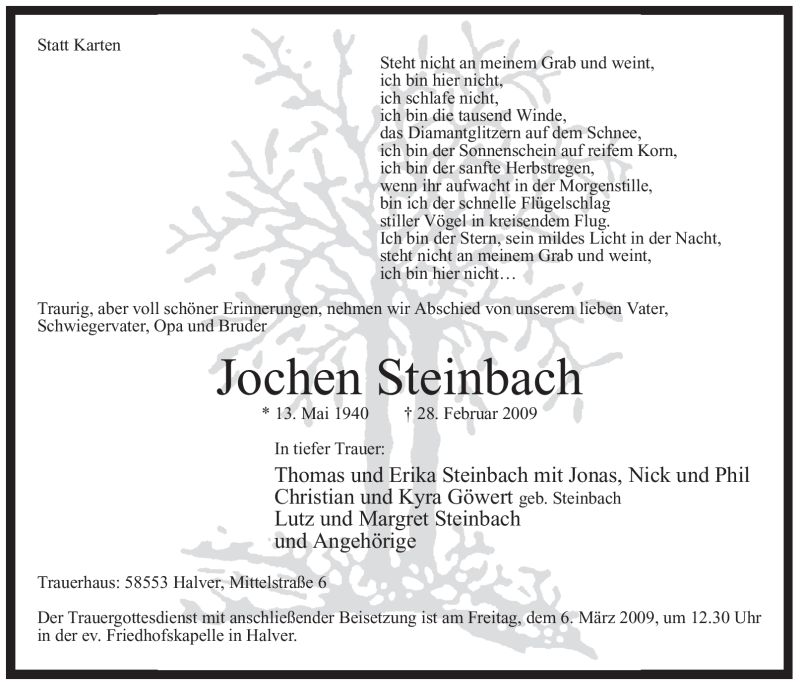 Hier finden Sie alle Traueranzeigen aus der Zeitung, die bisher für Jochen Steinbach erschienen sind. Weitere Traueranzeigen, die in der Zeitung erscheinen, werden hier ebenfalls aufgelistet