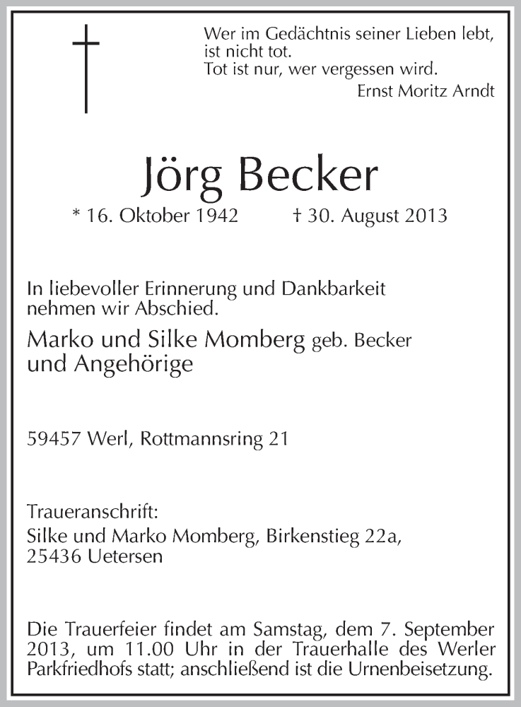 Hier finden Sie alle Traueranzeigen aus der Zeitung, die bisher für Jörg Becker erschienen sind. Weitere Traueranzeigen, die in der Zeitung erscheinen, werden hier ebenfalls aufgelistet