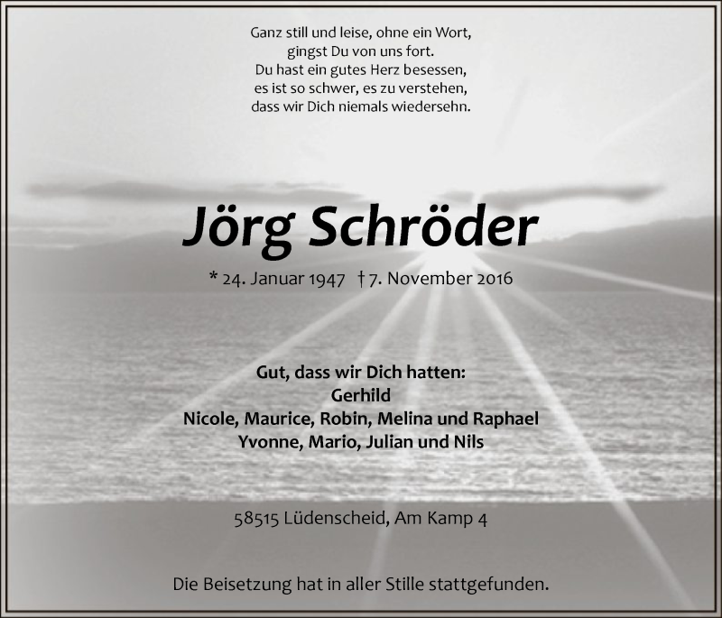 Hier finden Sie alle Traueranzeigen aus der Zeitung, die bisher für Jörg Schröder erschienen sind. Weitere Traueranzeigen, die in der Zeitung erscheinen, werden hier ebenfalls aufgelistet
