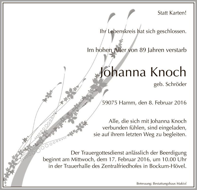 Hier finden Sie alle Traueranzeigen aus der Zeitung, die bisher für Johanna Knoch erschienen sind. Weitere Traueranzeigen, die in der Zeitung erscheinen, werden hier ebenfalls aufgelistet