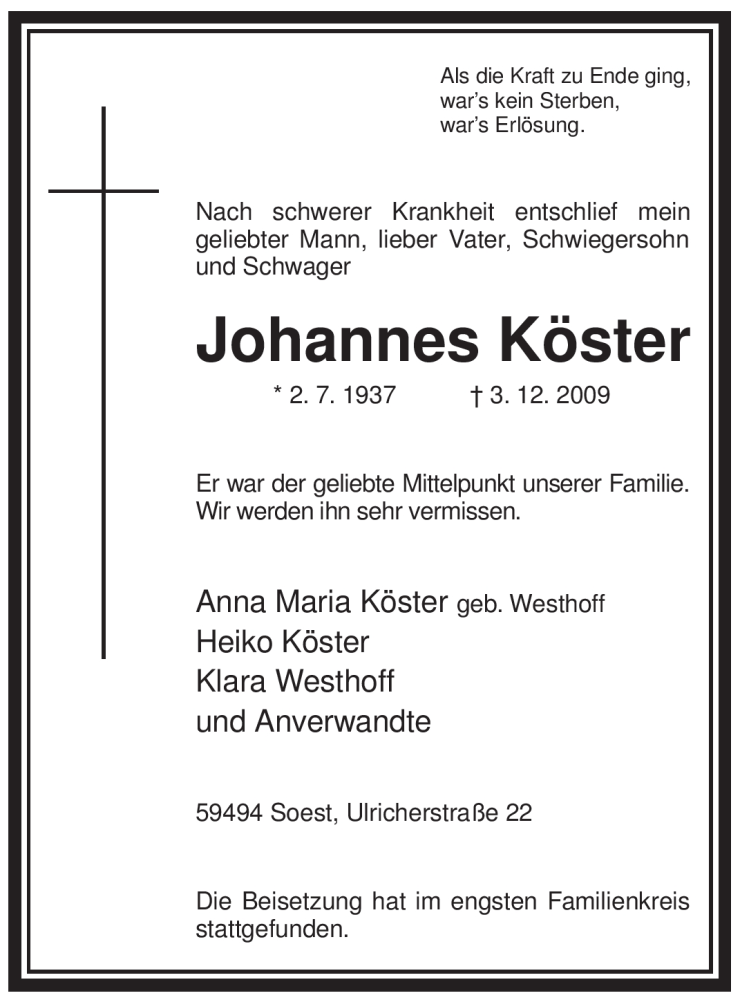 Hier finden Sie alle Traueranzeigen aus der Zeitung, die bisher für Johannes Köster erschienen sind. Weitere Traueranzeigen, die in der Zeitung erscheinen, werden hier ebenfalls aufgelistet