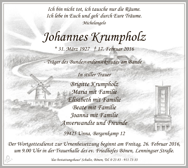 Hier finden Sie alle Traueranzeigen aus der Zeitung, die bisher für Johannes Krumpholz erschienen sind. Weitere Traueranzeigen, die in der Zeitung erscheinen, werden hier ebenfalls aufgelistet