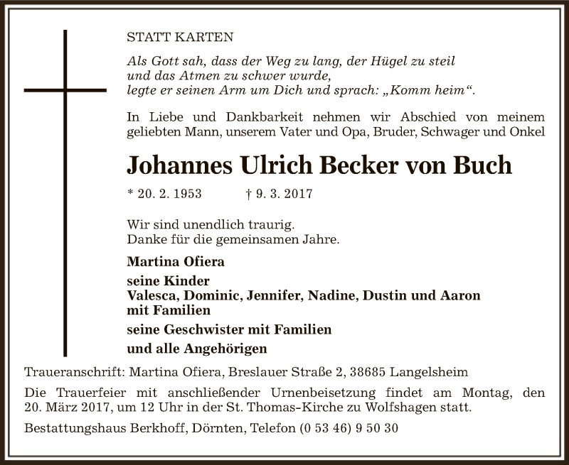 Hier finden Sie alle Traueranzeigen aus der Zeitung, die bisher für Johannes Ulrich Becker von Buch erschienen sind. Weitere Traueranzeigen, die in der Zeitung erscheinen, werden hier ebenfalls aufgelistet
