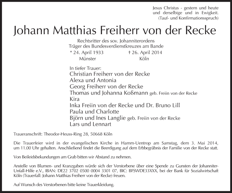Hier finden Sie alle Traueranzeigen aus der Zeitung, die bisher für Johann Matthias Freiherr von der Recke erschienen sind. Weitere Traueranzeigen, die in der Zeitung erscheinen, werden hier ebenfalls aufgelistet
