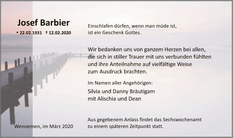 Hier finden Sie alle Traueranzeigen aus der Zeitung, die bisher für Josef Barbier erschienen sind. Weitere Traueranzeigen, die in der Zeitung erscheinen, werden hier ebenfalls aufgelistet
