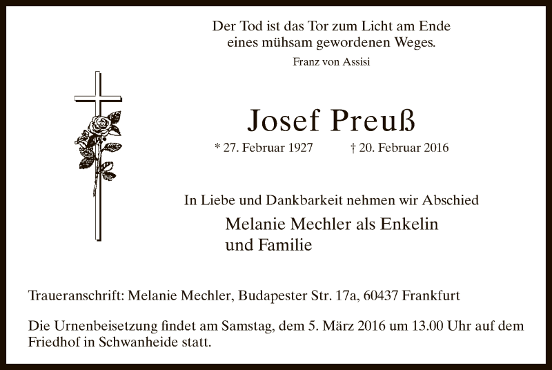 Hier finden Sie alle Traueranzeigen aus der Zeitung, die bisher für Josef Preuß erschienen sind. Weitere Traueranzeigen, die in der Zeitung erscheinen, werden hier ebenfalls aufgelistet