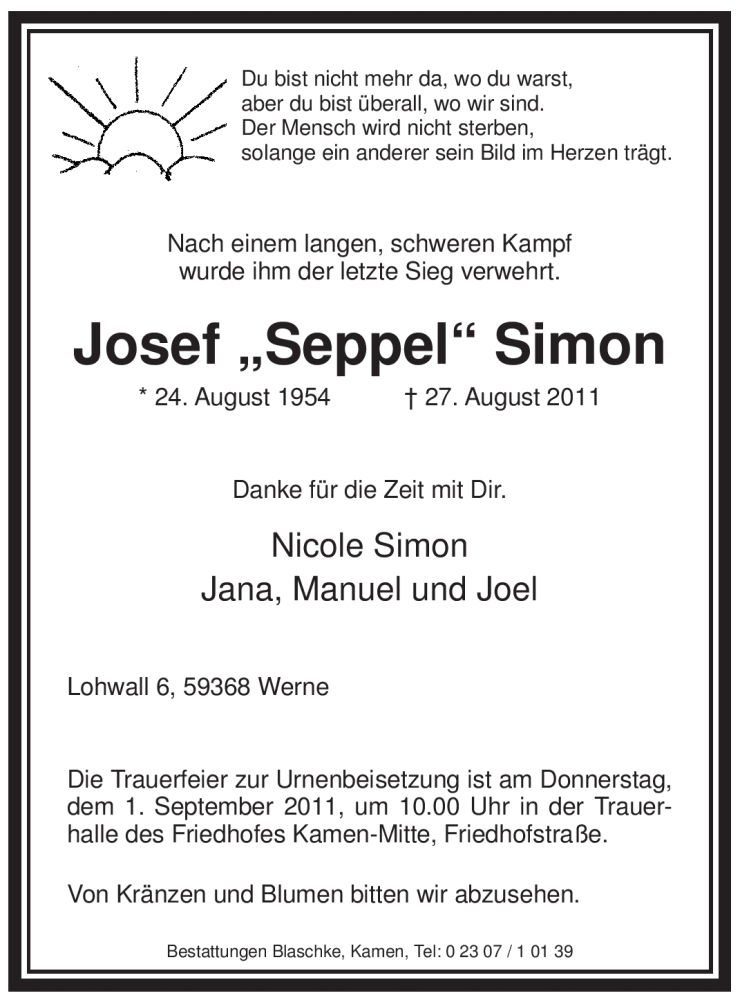Hier finden Sie alle Traueranzeigen aus der Zeitung, die bisher für Josef Simon erschienen sind. Weitere Traueranzeigen, die in der Zeitung erscheinen, werden hier ebenfalls aufgelistet