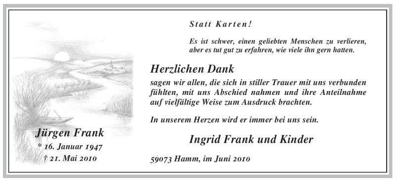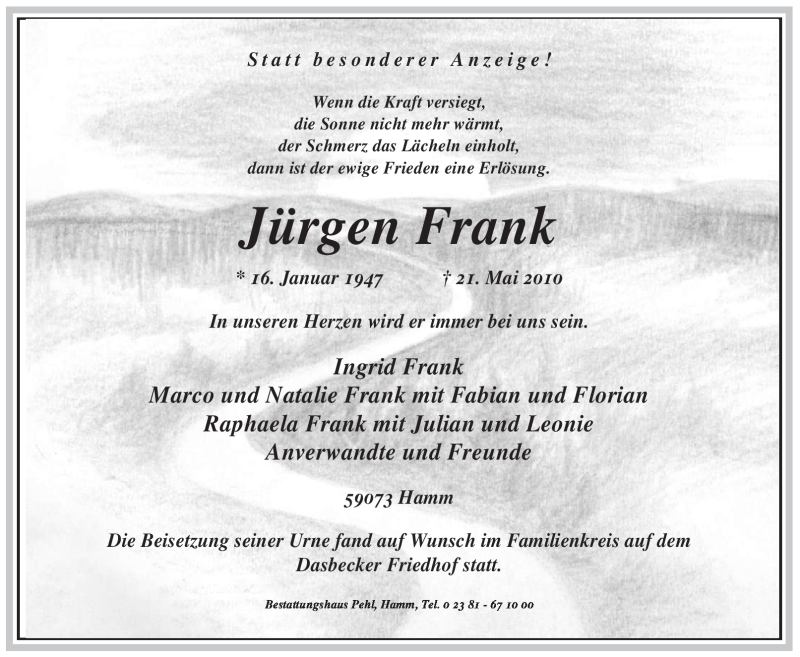 Hier finden Sie alle Traueranzeigen aus der Zeitung, die bisher für Jürgen Frank erschienen sind. Weitere Traueranzeigen, die in der Zeitung erscheinen, werden hier ebenfalls aufgelistet