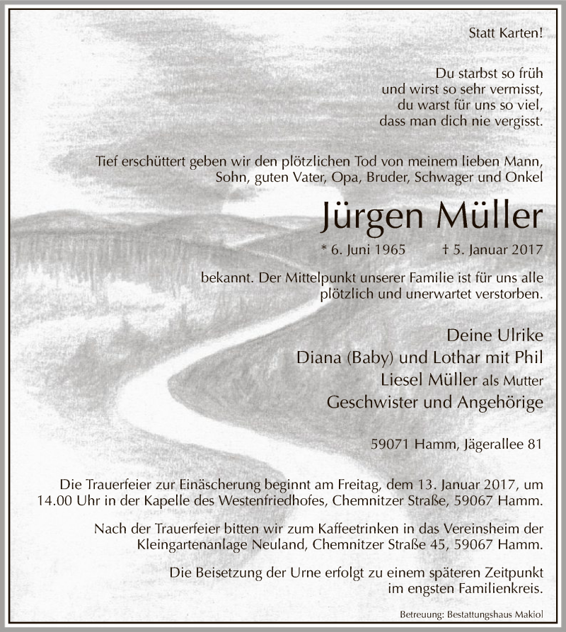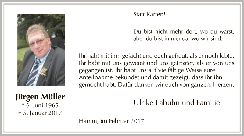 Hier finden Sie alle Traueranzeigen aus der Zeitung, die bisher für Jürgen Müller erschienen sind. Weitere Traueranzeigen, die in der Zeitung erscheinen, werden hier ebenfalls aufgelistet