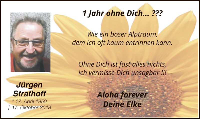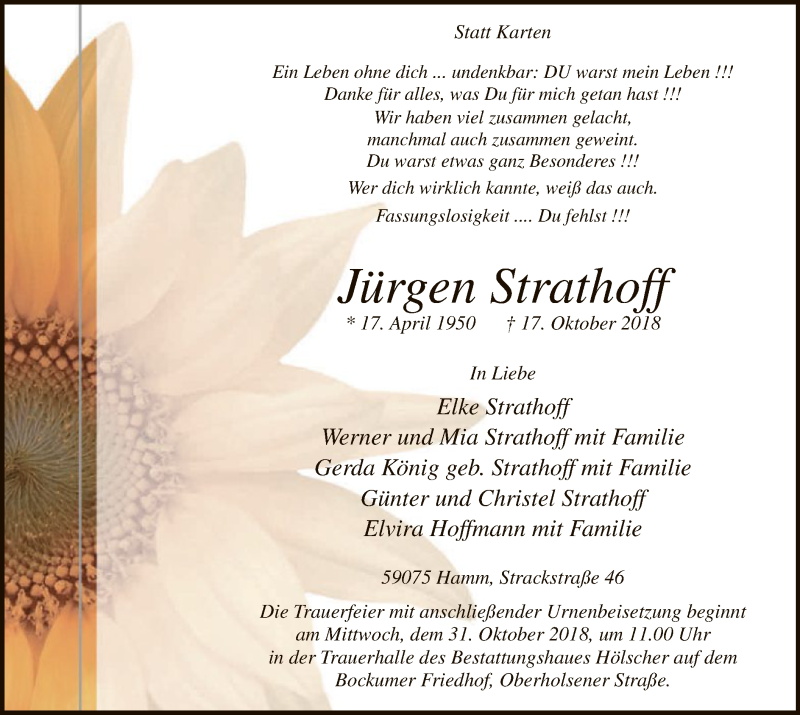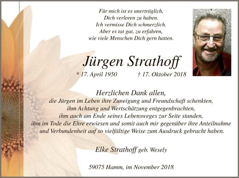 Hier finden Sie alle Traueranzeigen aus der Zeitung, die bisher für Jürgen Strathoff erschienen sind. Weitere Traueranzeigen, die in der Zeitung erscheinen, werden hier ebenfalls aufgelistet