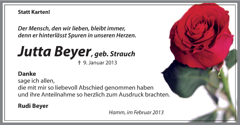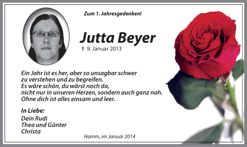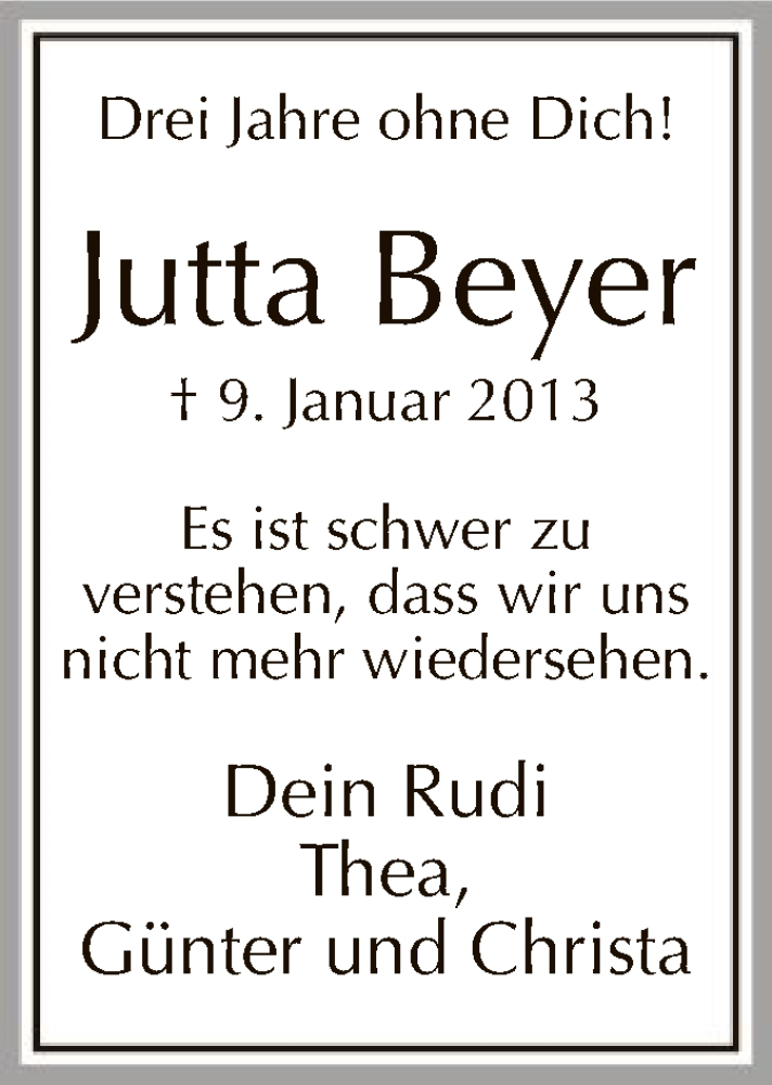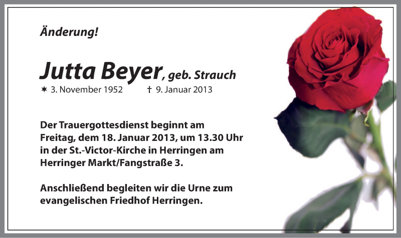 Hier finden Sie alle Traueranzeigen aus der Zeitung, die bisher für Jutta Beyer erschienen sind. Weitere Traueranzeigen, die in der Zeitung erscheinen, werden hier ebenfalls aufgelistet