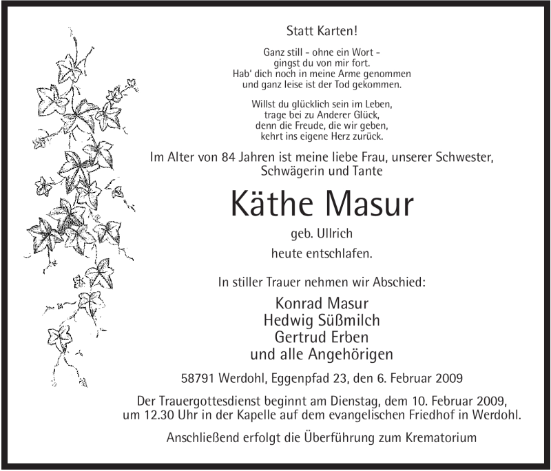Hier finden Sie alle Traueranzeigen aus der Zeitung, die bisher für Käthe Masur erschienen sind. Weitere Traueranzeigen, die in der Zeitung erscheinen, werden hier ebenfalls aufgelistet