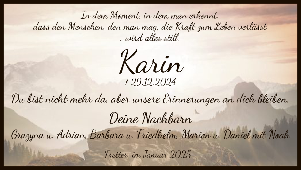 Hier finden Sie alle Traueranzeigen aus der Zeitung, die bisher für Karin erschienen sind. Weitere Traueranzeigen, die in der Zeitung erscheinen, werden hier ebenfalls aufgelistet