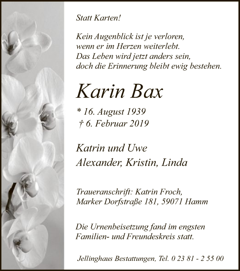 Hier finden Sie alle Traueranzeigen aus der Zeitung, die bisher für Karin Bax erschienen sind. Weitere Traueranzeigen, die in der Zeitung erscheinen, werden hier ebenfalls aufgelistet