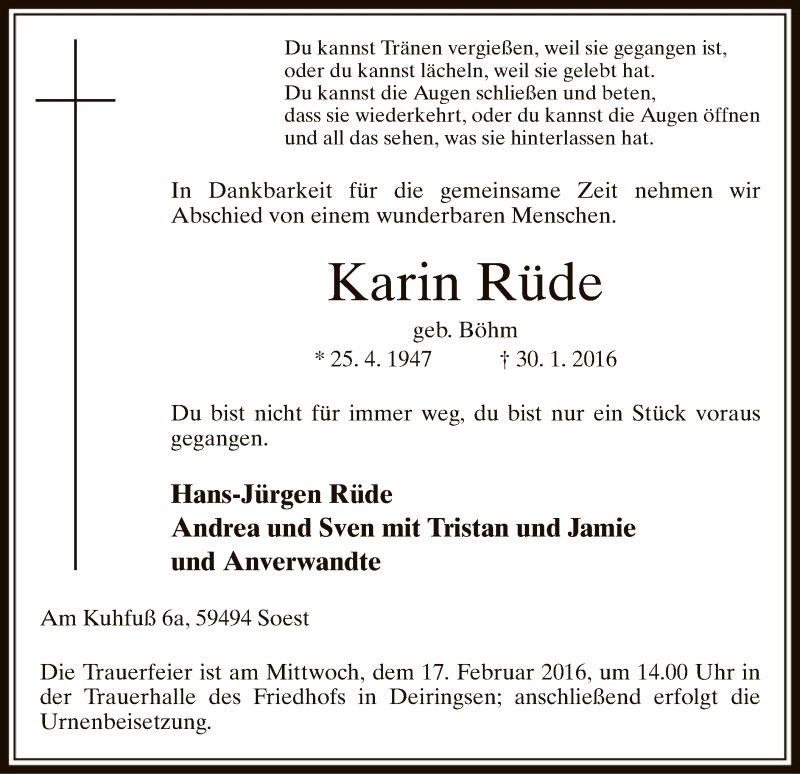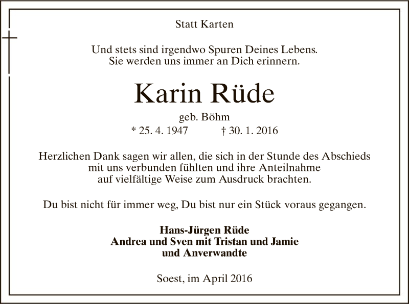 Hier finden Sie alle Traueranzeigen aus der Zeitung, die bisher für Karin Rüde erschienen sind. Weitere Traueranzeigen, die in der Zeitung erscheinen, werden hier ebenfalls aufgelistet