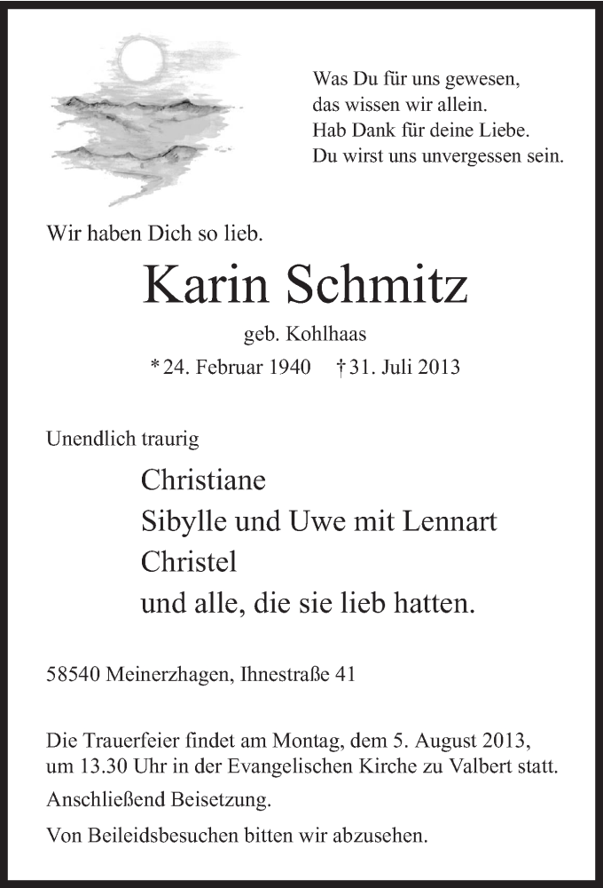 Hier finden Sie alle Traueranzeigen aus der Zeitung, die bisher für Karin Schmitz erschienen sind. Weitere Traueranzeigen, die in der Zeitung erscheinen, werden hier ebenfalls aufgelistet