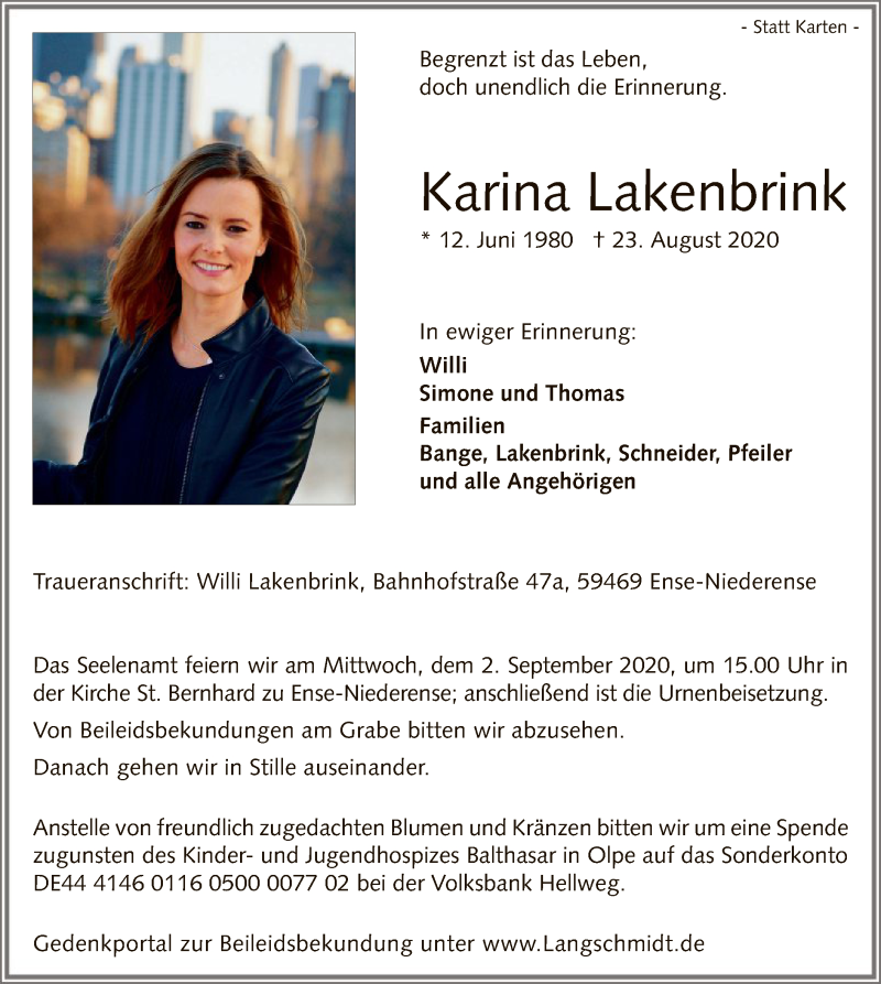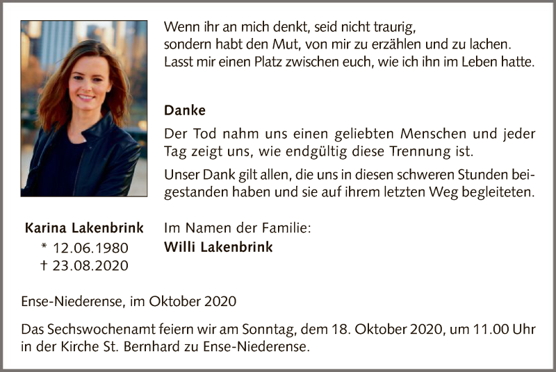 Hier finden Sie alle Traueranzeigen aus der Zeitung, die bisher für Karina Lakenbrink erschienen sind. Weitere Traueranzeigen, die in der Zeitung erscheinen, werden hier ebenfalls aufgelistet