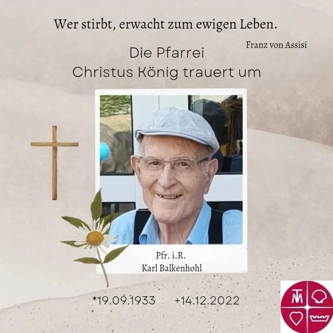 Die Pfarrei Christus König trauert um Pfr. i.R. Karl Balkenhol, der am 14.12.22 im Alter von 89 Jahren nach kurzer Krankheit unerwartet verstorben ist.Seit 1982 war er Pfarrer in Halver, seit 2006 als Pensionär weiterhin aktiv in der Seelsorge unserer Gemeinden. Dankbar für viel Gutes in den langen Jahren dürfen wir Abschied nehmen und ihn dem Gott des Lebens anvertrauen.