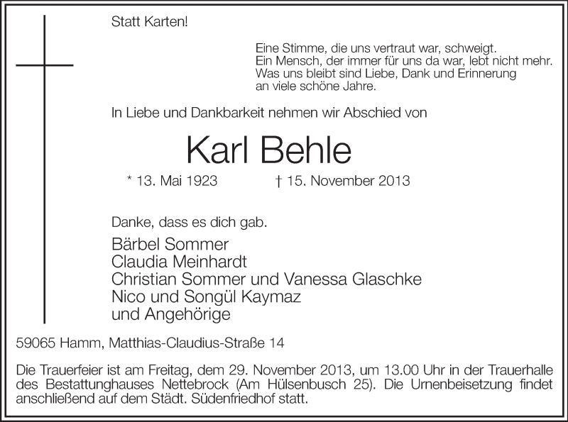 Hier finden Sie alle Traueranzeigen aus der Zeitung, die bisher für Karl Behle erschienen sind. Weitere Traueranzeigen, die in der Zeitung erscheinen, werden hier ebenfalls aufgelistet