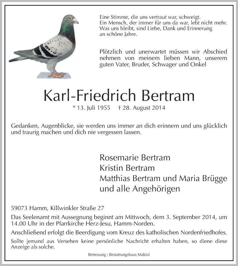 Hier finden Sie alle Traueranzeigen aus der Zeitung, die bisher für Karl-Friedrich Bertram erschienen sind. Weitere Traueranzeigen, die in der Zeitung erscheinen, werden hier ebenfalls aufgelistet