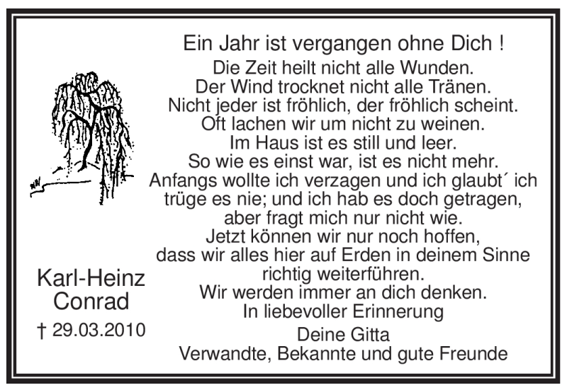 Hier finden Sie alle Traueranzeigen aus der Zeitung, die bisher für Karl-Heinz Conrad erschienen sind. Weitere Traueranzeigen, die in der Zeitung erscheinen, werden hier ebenfalls aufgelistet