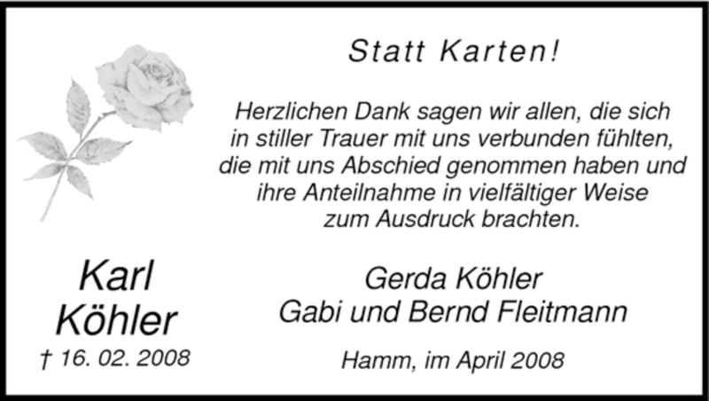 Hier finden Sie alle Traueranzeigen aus der Zeitung, die bisher für Karl Köhler erschienen sind. Weitere Traueranzeigen, die in der Zeitung erscheinen, werden hier ebenfalls aufgelistet