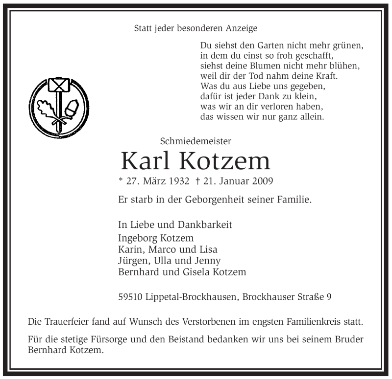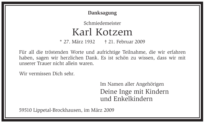 Hier finden Sie alle Traueranzeigen aus der Zeitung, die bisher für Karl Kotzem erschienen sind. Weitere Traueranzeigen, die in der Zeitung erscheinen, werden hier ebenfalls aufgelistet