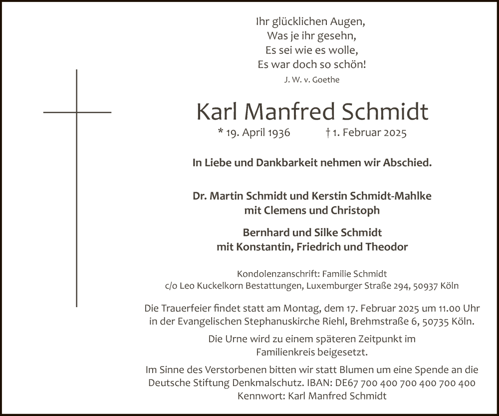 Hier finden Sie alle Traueranzeigen aus der Zeitung, die bisher für Karl Manfred Schmidt erschienen sind. Weitere Traueranzeigen, die in der Zeitung erscheinen, werden hier ebenfalls aufgelistet