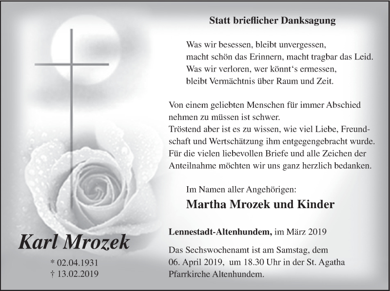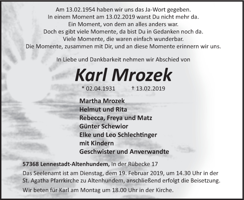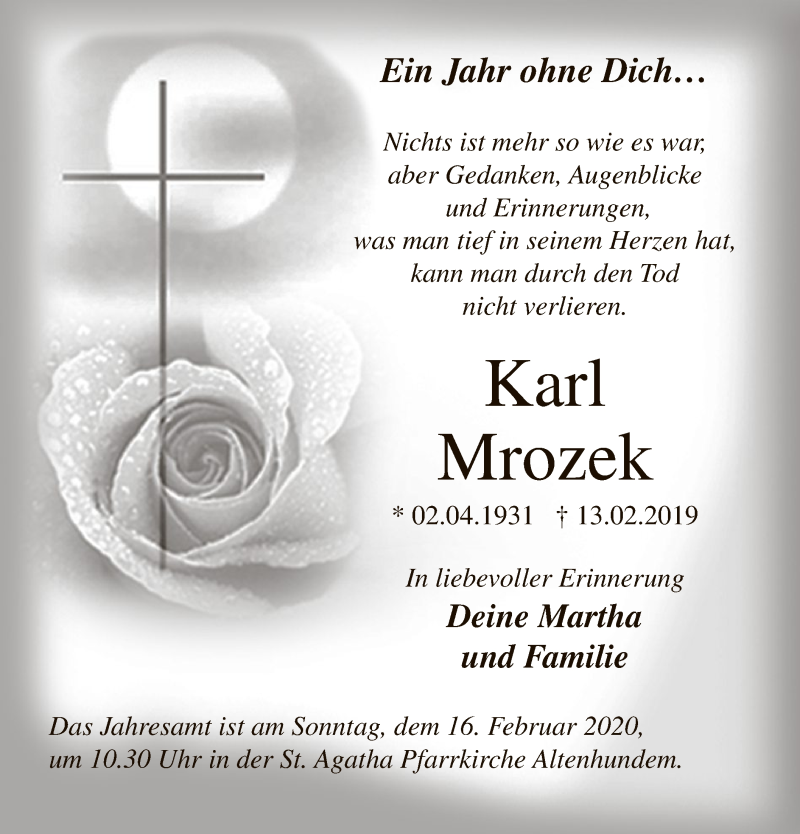 Hier finden Sie alle Traueranzeigen aus der Zeitung, die bisher für Karl Mrozek erschienen sind. Weitere Traueranzeigen, die in der Zeitung erscheinen, werden hier ebenfalls aufgelistet