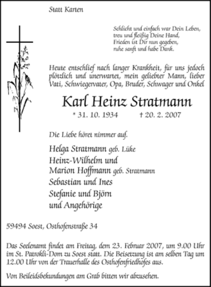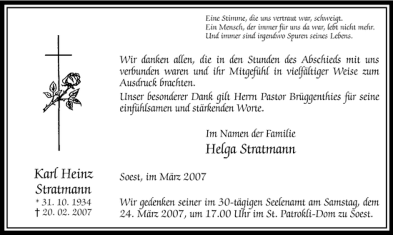 Hier finden Sie alle Traueranzeigen aus der Zeitung, die bisher für Karl Heinz Stratmann erschienen sind. Weitere Traueranzeigen, die in der Zeitung erscheinen, werden hier ebenfalls aufgelistet
