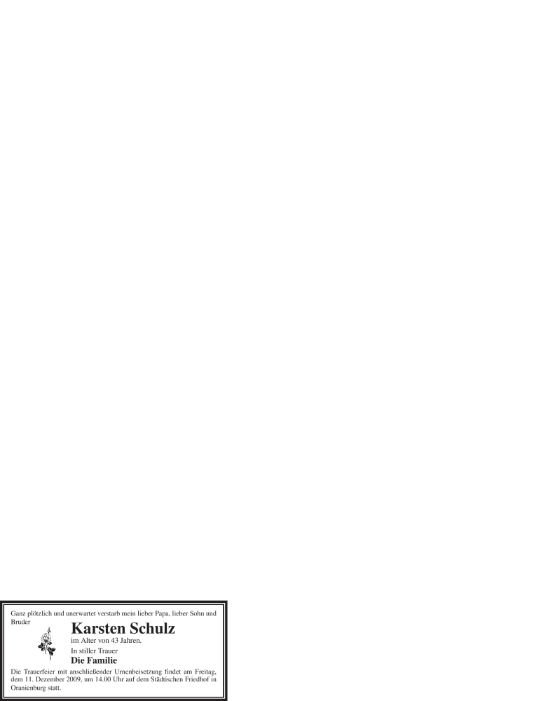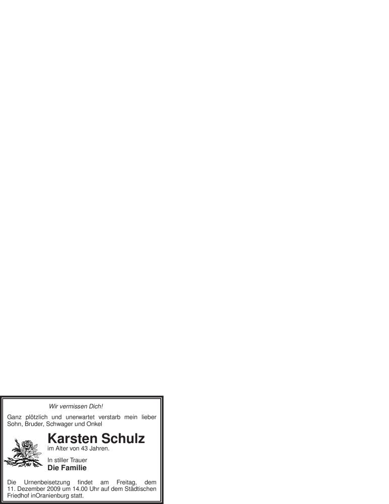 Hier finden Sie alle Traueranzeigen aus der Zeitung, die bisher für Karsten Schulz erschienen sind. Weitere Traueranzeigen, die in der Zeitung erscheinen, werden hier ebenfalls aufgelistet