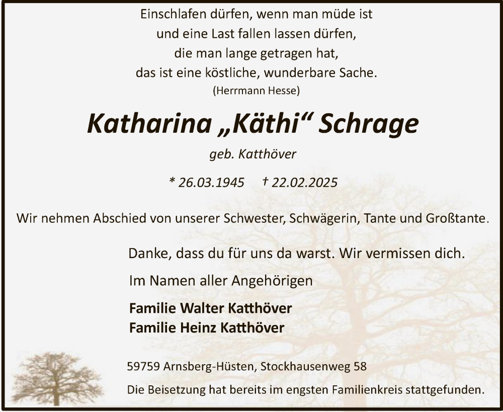 Hier finden Sie alle Traueranzeigen aus der Zeitung, die bisher für Katharina Schrage erschienen sind. Weitere Traueranzeigen, die in der Zeitung erscheinen, werden hier ebenfalls aufgelistet