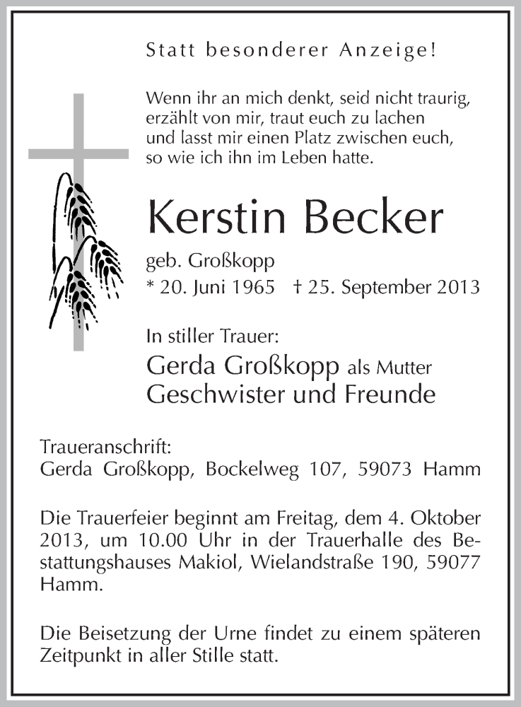 Hier finden Sie alle Traueranzeigen aus der Zeitung, die bisher für Kerstin Becker erschienen sind. Weitere Traueranzeigen, die in der Zeitung erscheinen, werden hier ebenfalls aufgelistet