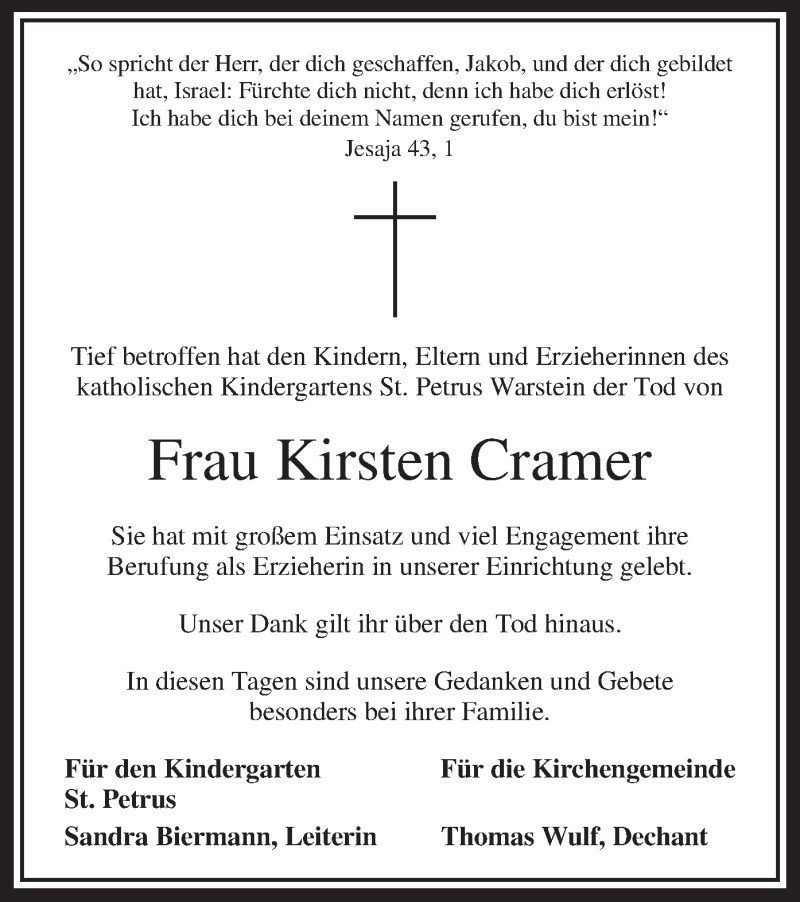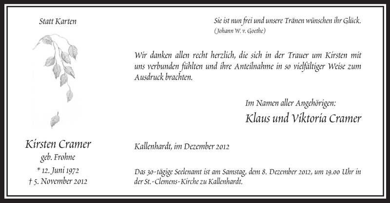 Hier finden Sie alle Traueranzeigen aus der Zeitung, die bisher für Kirsten Cramer erschienen sind. Weitere Traueranzeigen, die in der Zeitung erscheinen, werden hier ebenfalls aufgelistet