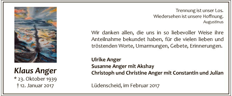 Hier finden Sie alle Traueranzeigen aus der Zeitung, die bisher für Klaus Anger erschienen sind. Weitere Traueranzeigen, die in der Zeitung erscheinen, werden hier ebenfalls aufgelistet