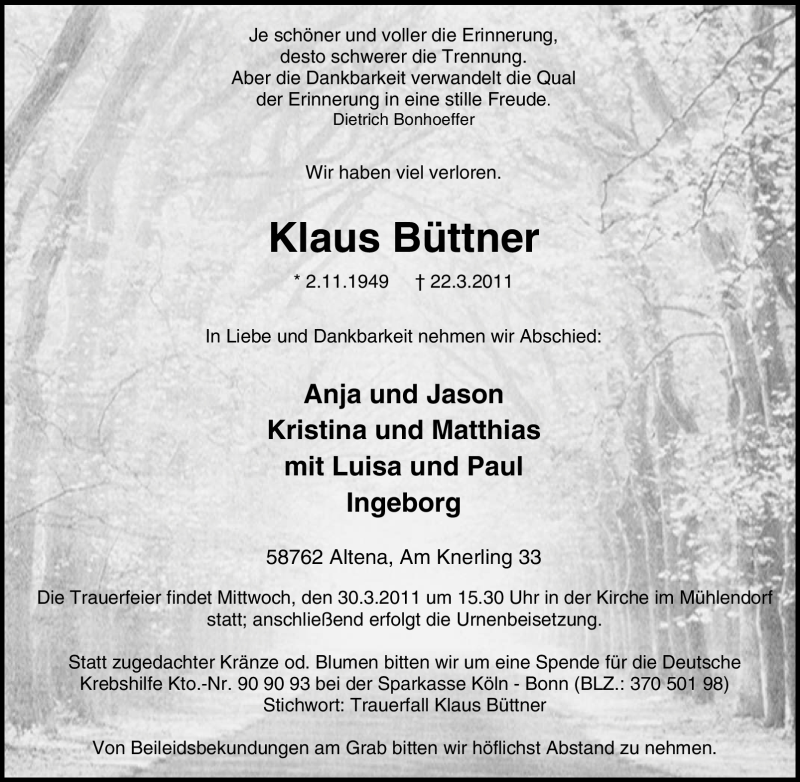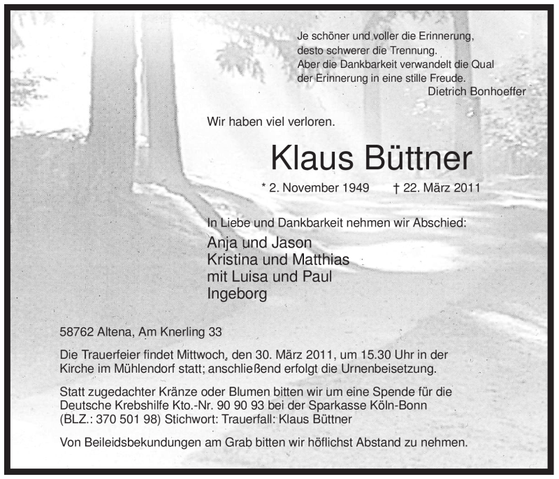 Hier finden Sie alle Traueranzeigen aus der Zeitung, die bisher für Klaus Büttner erschienen sind. Weitere Traueranzeigen, die in der Zeitung erscheinen, werden hier ebenfalls aufgelistet