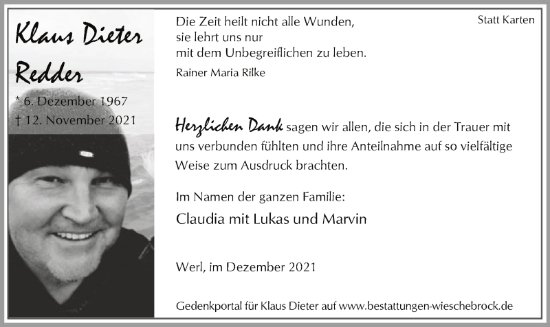 Hier finden Sie alle Traueranzeigen aus der Zeitung, die bisher für Klaus Dieter Redder erschienen sind. Weitere Traueranzeigen, die in der Zeitung erscheinen, werden hier ebenfalls aufgelistet