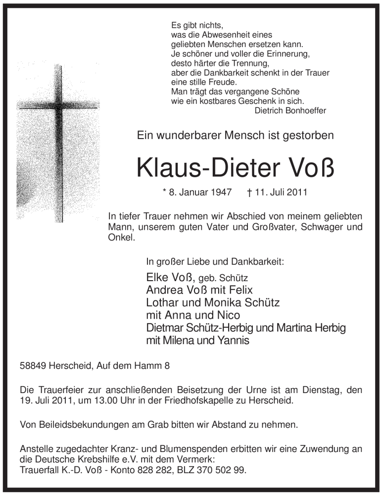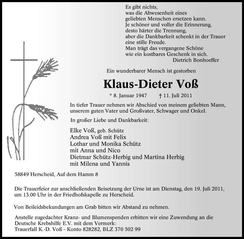 Hier finden Sie alle Traueranzeigen aus der Zeitung, die bisher für Klaus-Dieter Voß erschienen sind. Weitere Traueranzeigen, die in der Zeitung erscheinen, werden hier ebenfalls aufgelistet