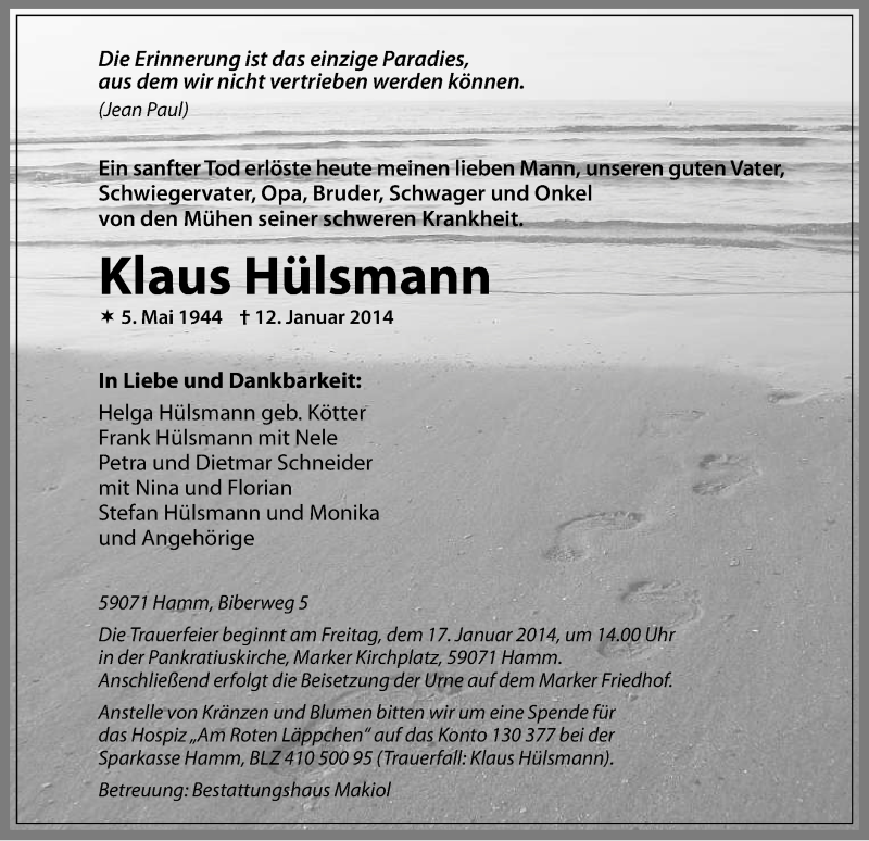 Hier finden Sie alle Traueranzeigen aus der Zeitung, die bisher für Klaus Hülsmann erschienen sind. Weitere Traueranzeigen, die in der Zeitung erscheinen, werden hier ebenfalls aufgelistet
